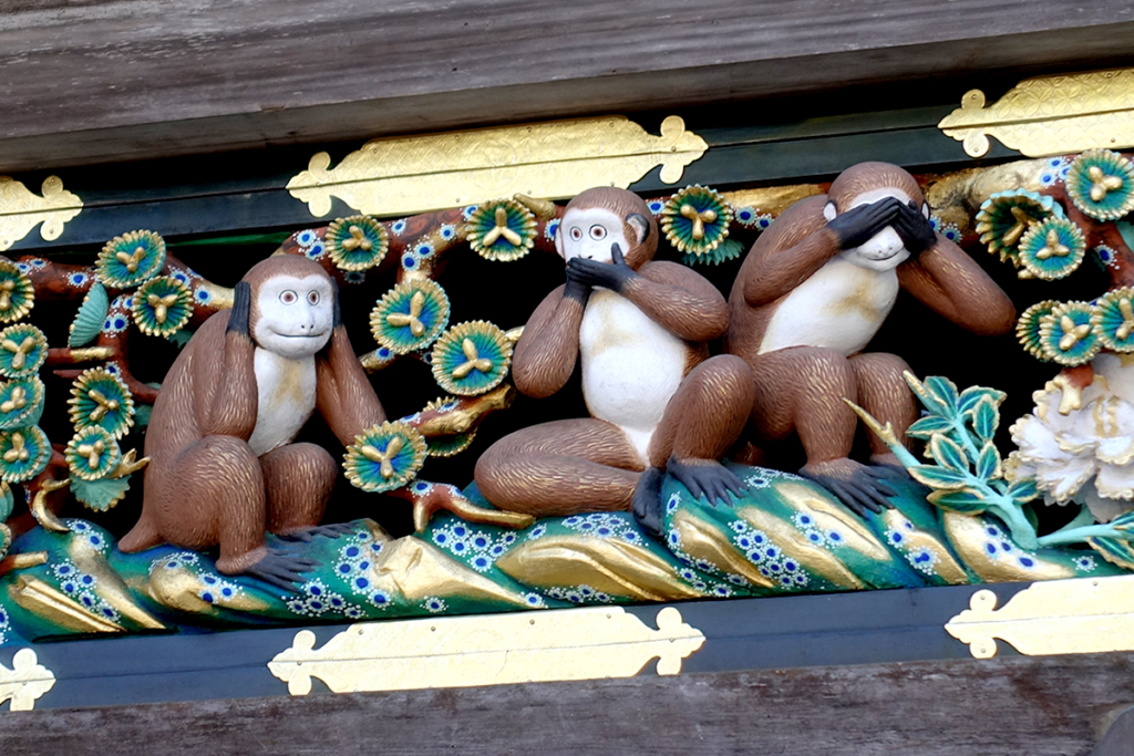 神厩舎(しんきゅうしゃ)に掘られている彫刻の猿たちは生まれてから大人になるまでの物語が描かれています。「見ざる・言わざる・聞かざる」は幼少の頃の猿たちとのこと。正面にある三神庫に見とれて、こちらもまた友人に振り向かせてもらわなければうっかり気付きませんでした。