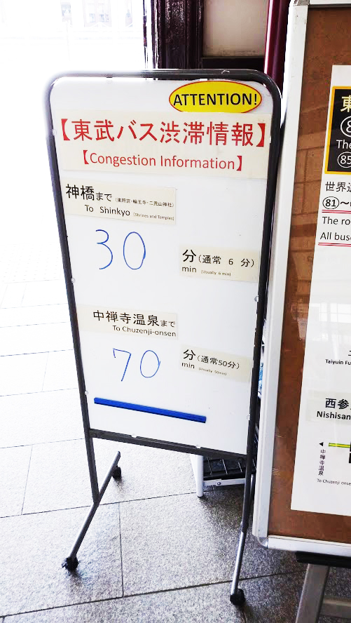 朝は時間通りにバスは走ったのですが、お昼頃、東照宮方面の道は渋滞していました。駅に着くと、バスの渋滞情報の掲示が。(三連休の青天の中日で約30分遅延していました。)